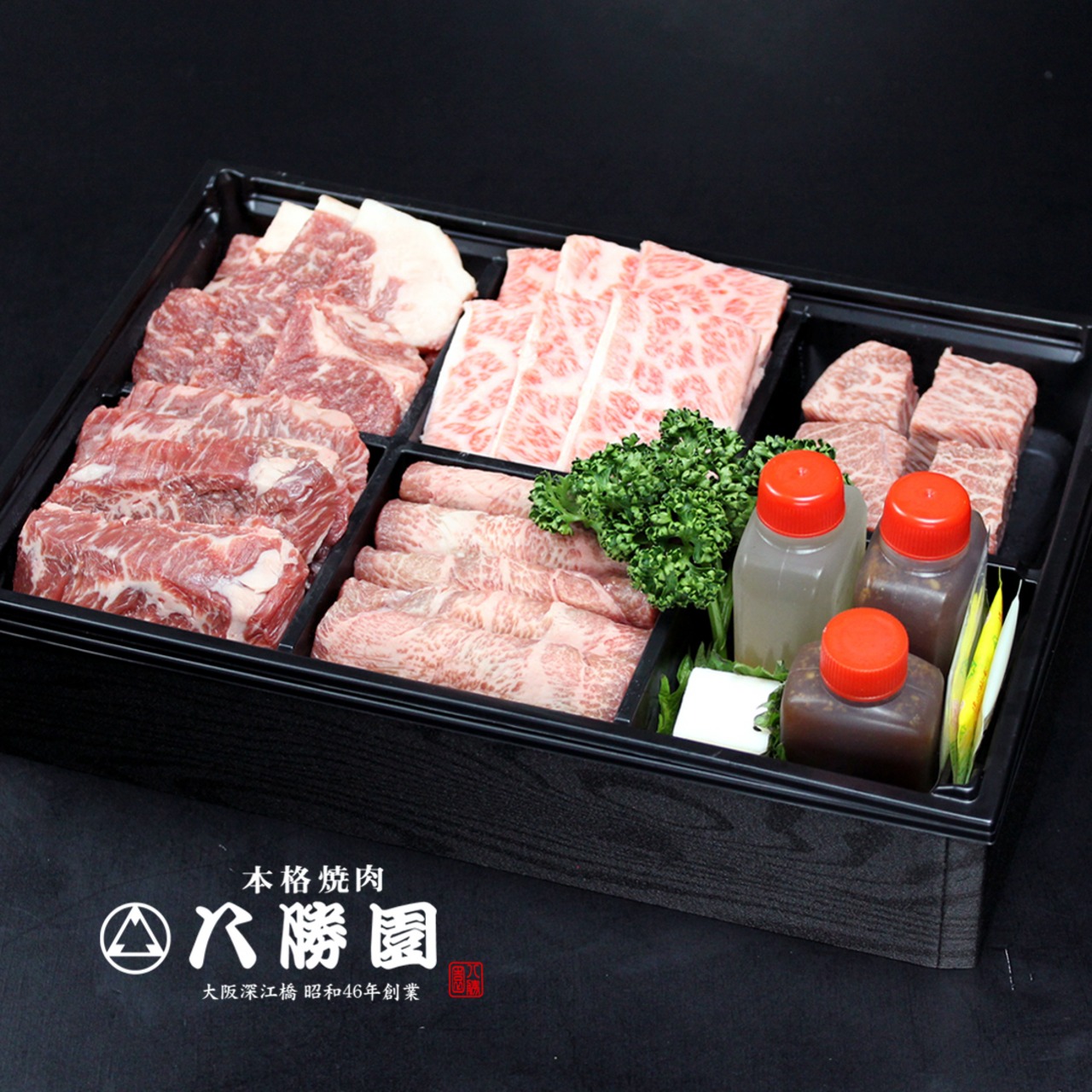 八勝園の焼肉人気メニューの詰め合わせ。みためにも高級なワン折重に一品ひと品、真心こめて綺麗に詰め込みました。保存はそのまま冷凍庫に入れていただき、お召し上がり前日に冷蔵庫に移し解凍して、そのまま食卓にお出しください。