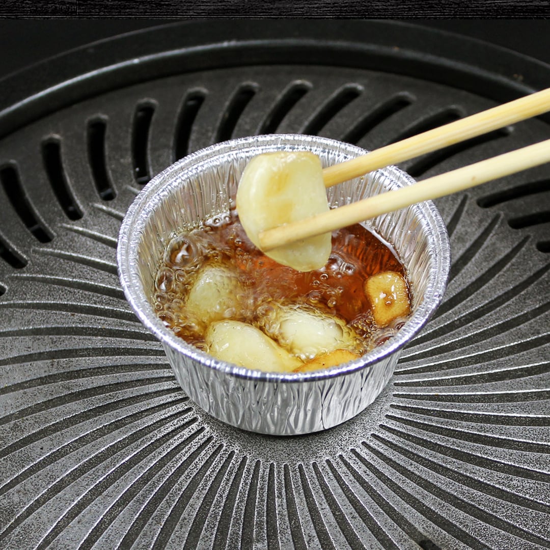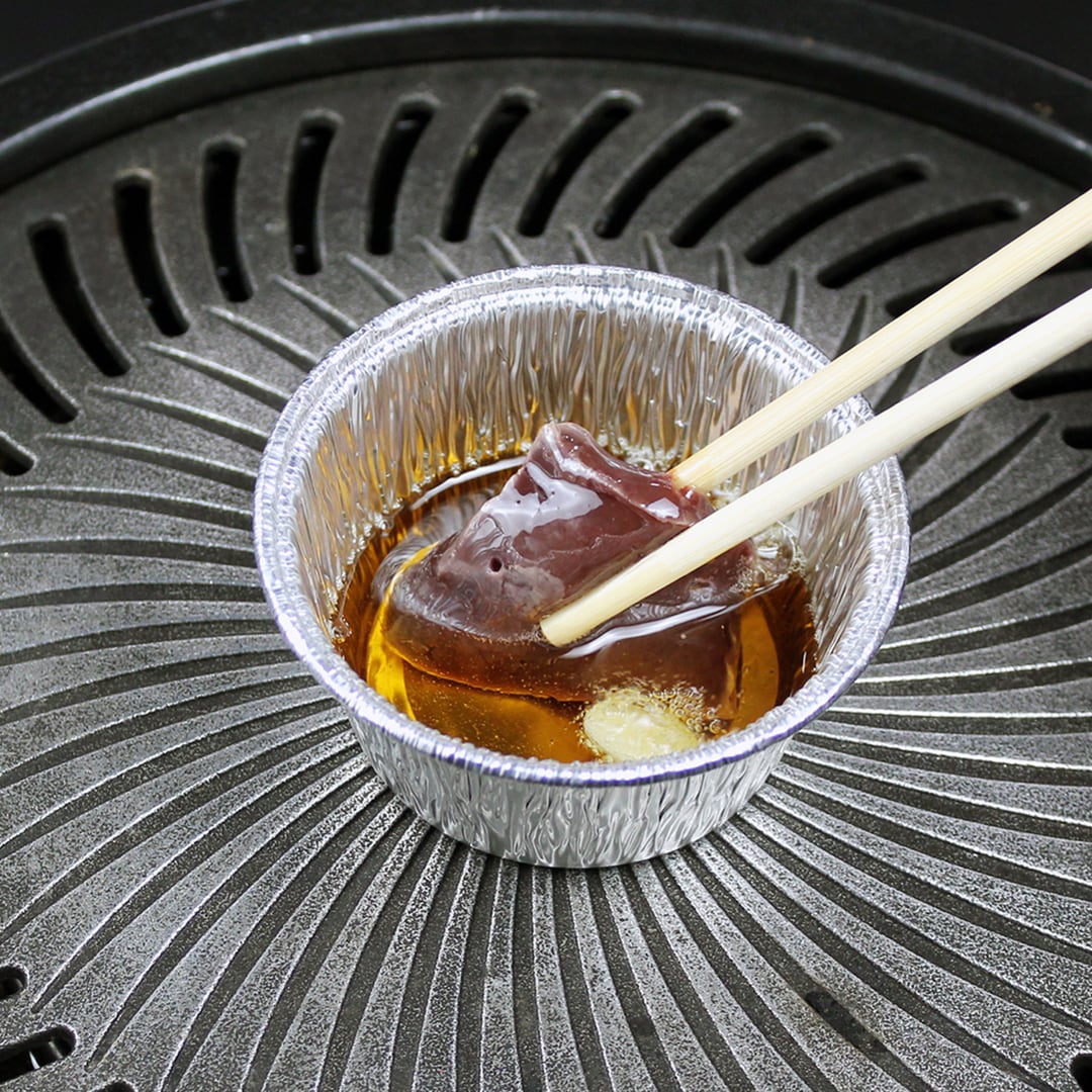 ③アルミ容器に別添具材のゴマ油を注ぎニンニクスライスを1枚入れて加熱してください。ニンニクスライスの周りから気泡が沸いてでたらレバーをゴマ油の中でつけてお好みの揚げ加減でお召し上がりください。別添具材の塩コショウを小皿に移し揚がったレバーを軽く塩コショウにつけてお召し上がりください。